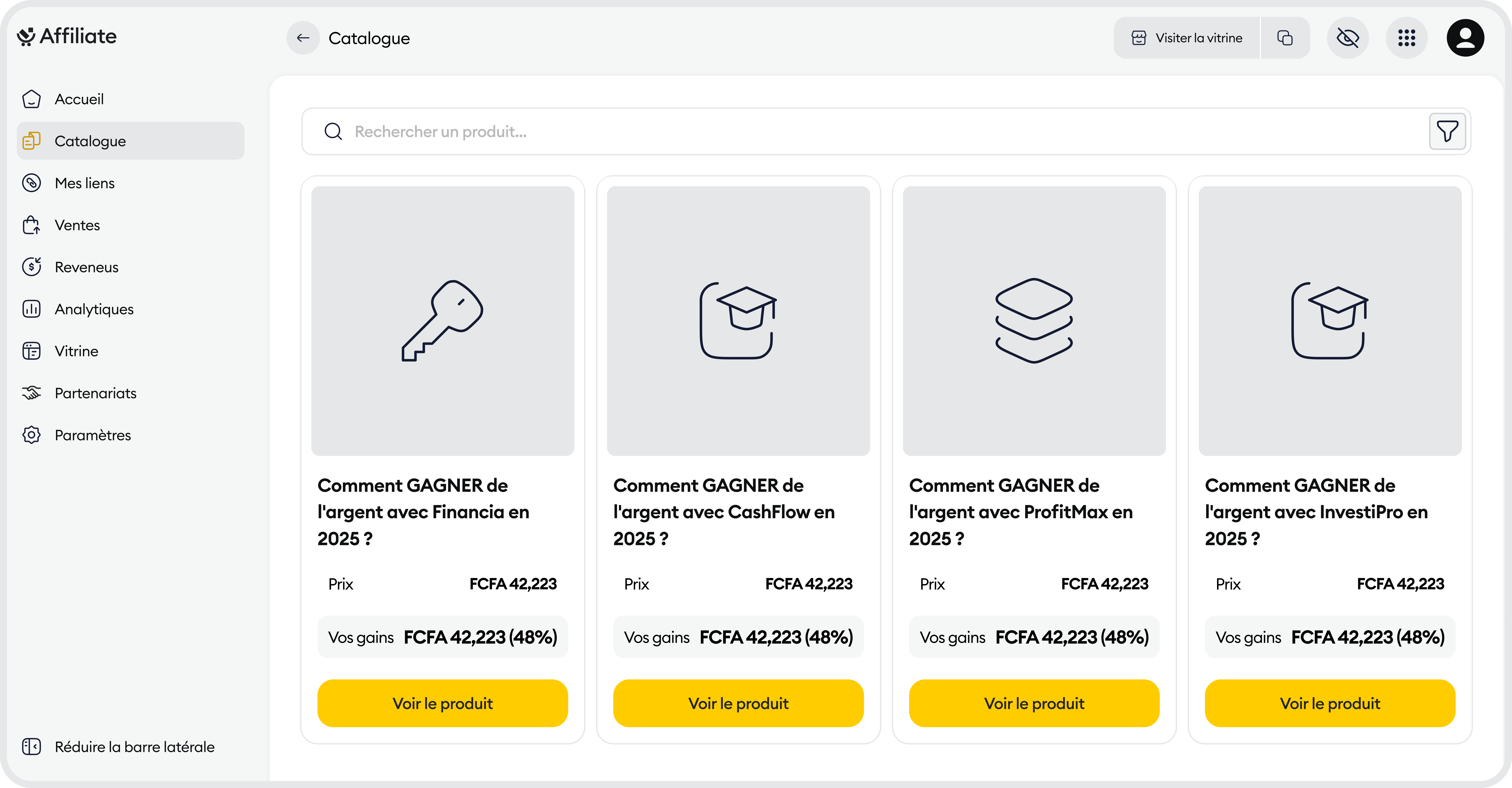 Parcourez notre marketplace et sélectionnez les produits qui correspondent à votre audience. Chaque produit inclut son taux de commission et ses supports promotionnels.